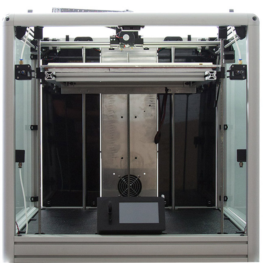 Printer frames are built with extruded aluminum alloy with a hard-anodized layer to protect the surface from oxidation and withstand the constant high temperatures and vibrations during long print jobs. All electronics and mechanical features are assembled using precision laser-cut aluminum fabrications and 3D-printed components.